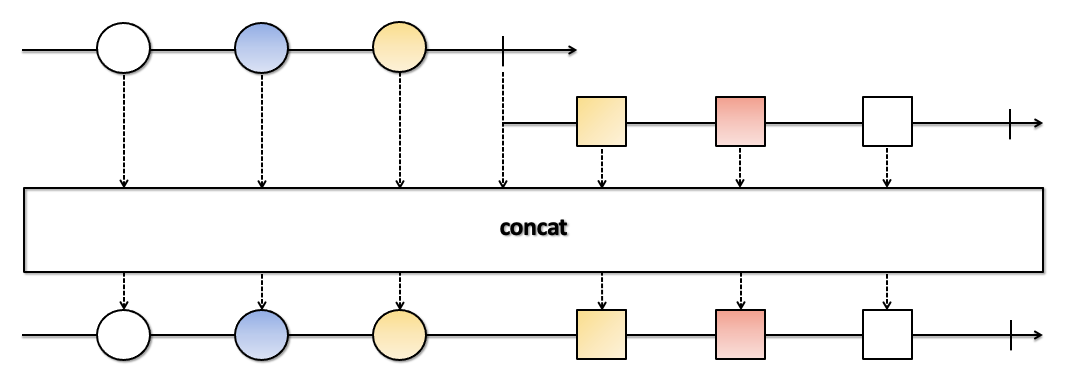 - 각 Observable의 통지 시점과는 상관없이 concat() 함수의 파라미터로 먼저 입력된 Observable의 데이터부터 모두 통지된 후, 다음 Observable의 데이터가 통지됩니다.