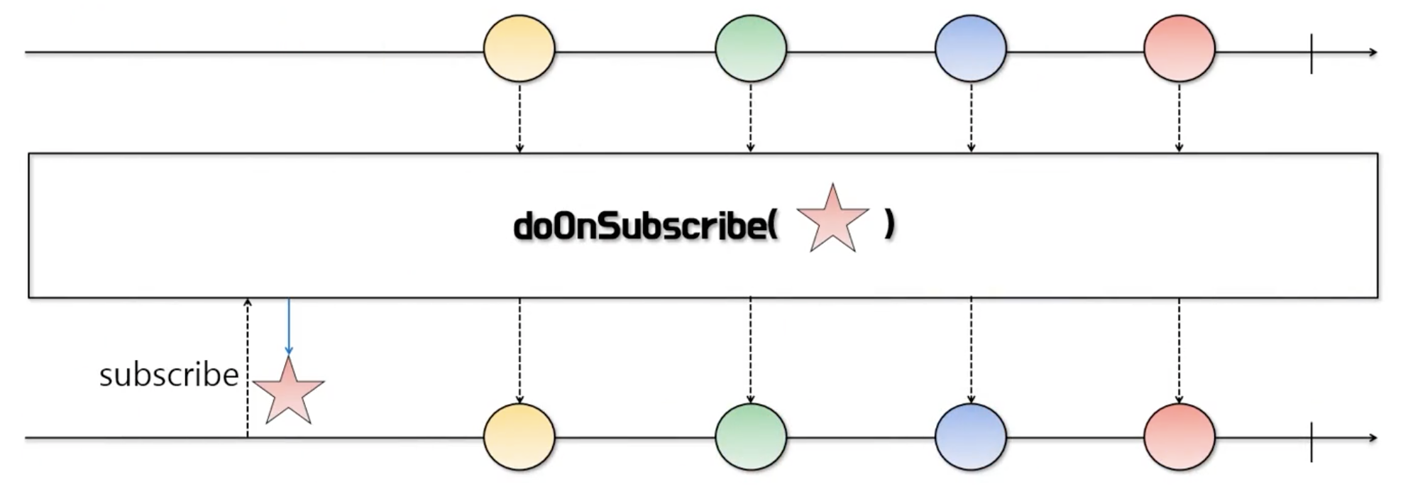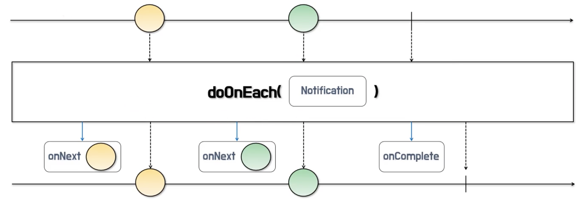 이러한 문제점을 해결하기 위해 RxJava에서는 doXXX로 시작하는 함수를 통해 생산자나 소비자쪽에서 이벤트 발생 시 로그를 기록할 수 있는 방법을 제공합니다. 따라서 소비자가 전달 받은 데이터를 처리하기 전 원본 데이터의 상태나 변환 및 필터링 등으로 가공되는 시점의 데이터 상태를 doXXX 함수를 통해 쉽게 파악할 수 있습니다.