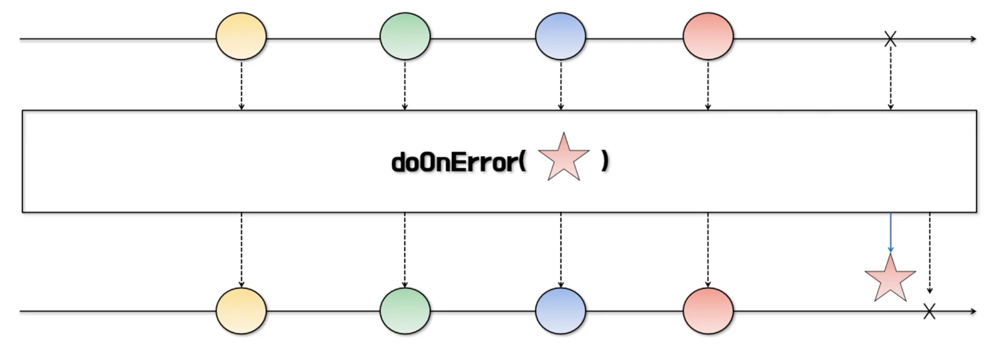 package com.itvillage.section02; import com.itvillage.utils.LogType; import com.itvillage.utils.Logger; import io.reactivex.Observable; /** * onComplete 이벤트 발생 전에 호출되는 doOnComplete 의 사용 예제 */ public class DoOnCompleteExample { public static void main(String[] args) { Observable.range(1, 5) .doOnComplete(() -> Logger.log(LogType.DO_ON_COMPLETE, "# 생산자: 데이터 통지 완료")) .subscribe( data -> Logger.log(LogType.ON_NEXT, data), error -> Logger.log(LogType.ON_ERROR, error), () -> Logger.log(LogType.ON_COMPLETE) ); } }doOnError
