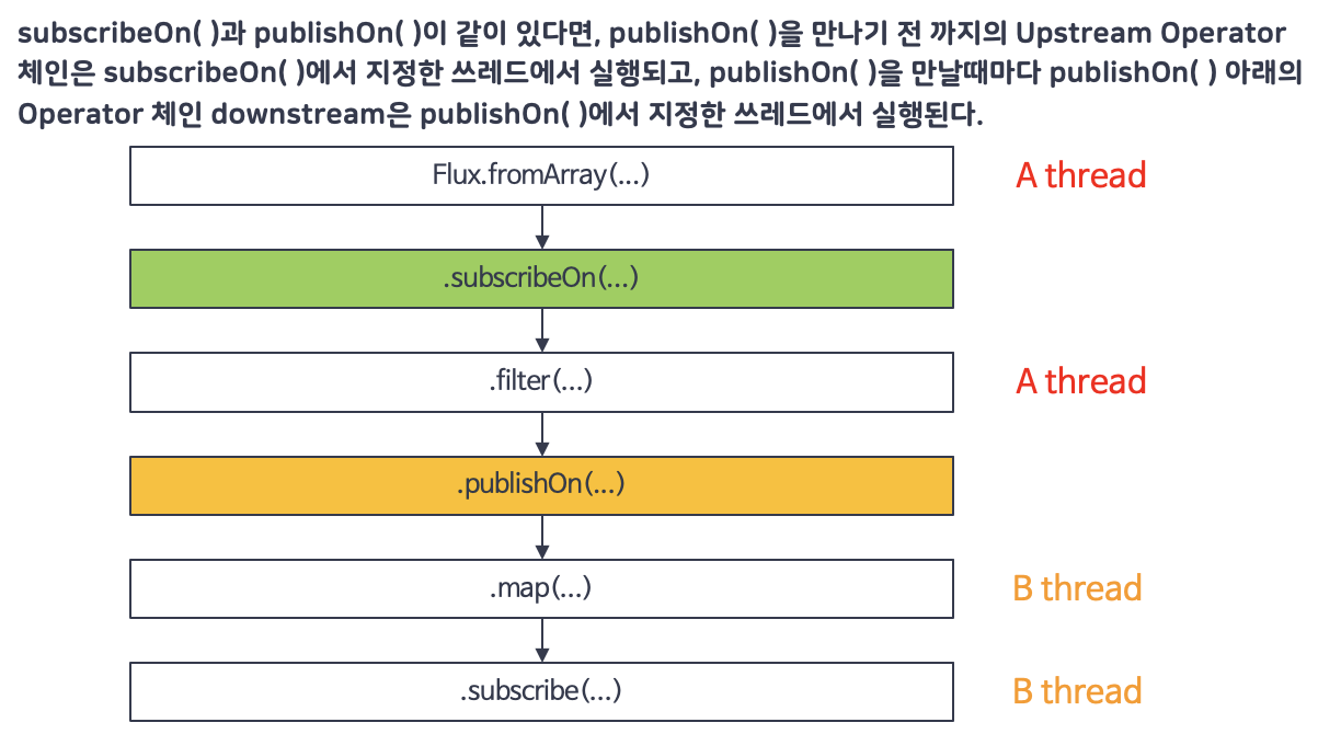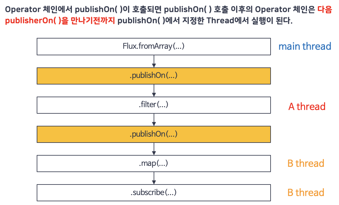 - publishOn(): Operator 체인에서 Downstream Operator의 실행을 위한 스레드를 지정합니다.