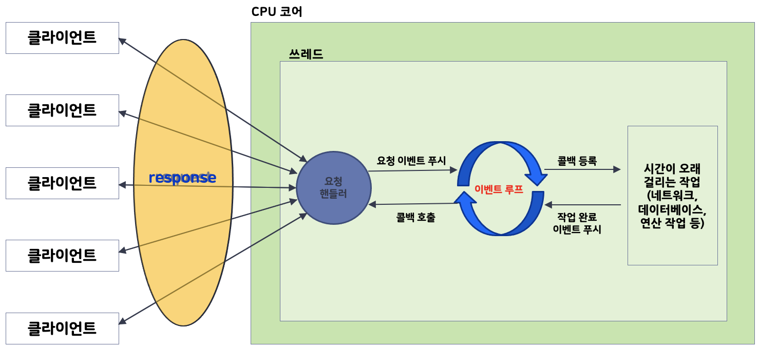 이벤트 루프는 단일 스레드에서 계속 실행되며, 클라이언트의 요청이나 데이터베이스 I/O, 네트워크 I/O 등 모든 작업들이 이벤트로 처리되기 때문에 이벤트 발생 시 해당 이벤트에 대한 콜백을 등록함과 동시에 다음 이벤트 처리로 넘어갑니다.