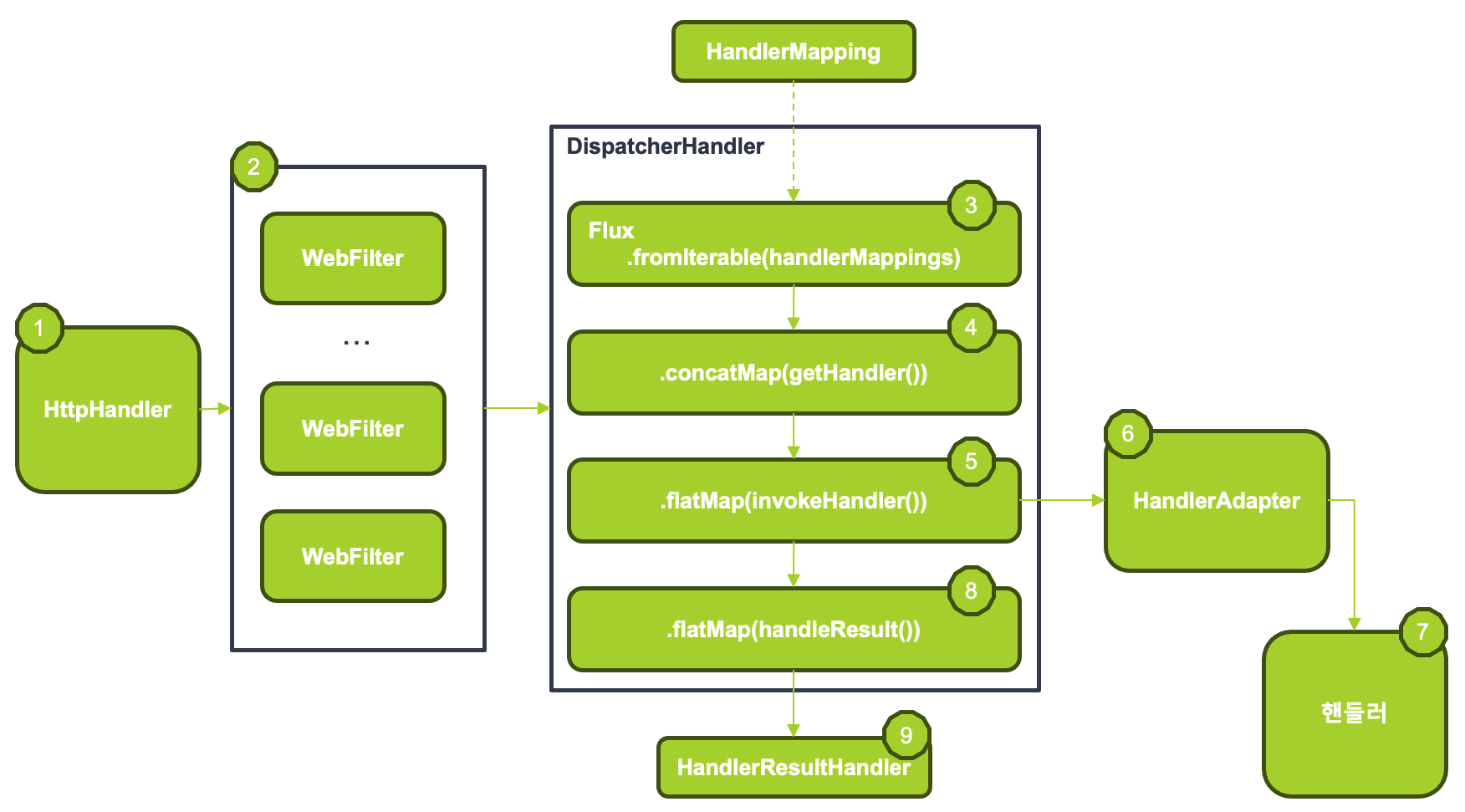 - Spring MVC의 DispatcherServlet과 유사한 역할을 하는 DispatcherHandler에서는 HandlerMapping List를 원본 Flux의 소스로 전달 받습니다.