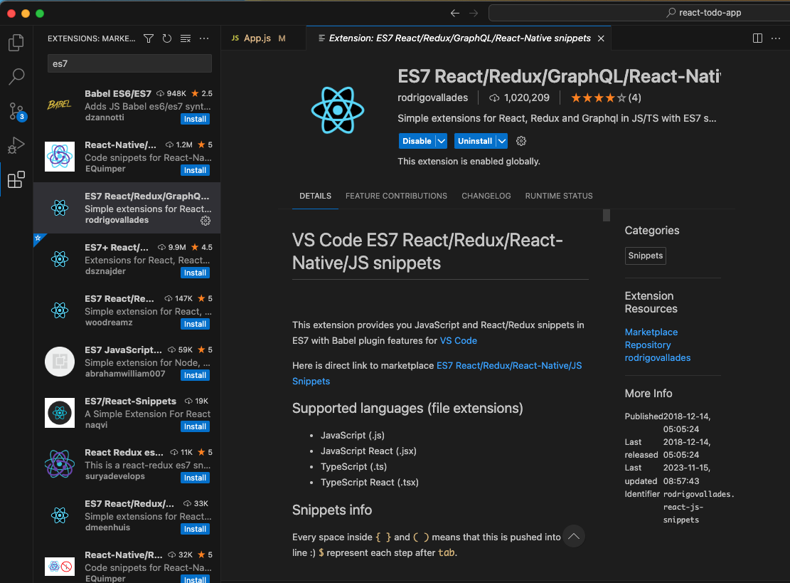 - ES7 React / Redux / GrapthQL / React-Native snippets: 키워드로 편리하게 리액트에서 쓰이는 구조를 만들어 줍니다. rfc 키워드의 경우, 아래 코드를 자동으로 완성해 줍니다. 추가 키워드는 다음을 참고하시면 됩니다. https://github.com/ults-io/vscode-react-javascript-snippets/blob/HEAD/docs/Snippets.md