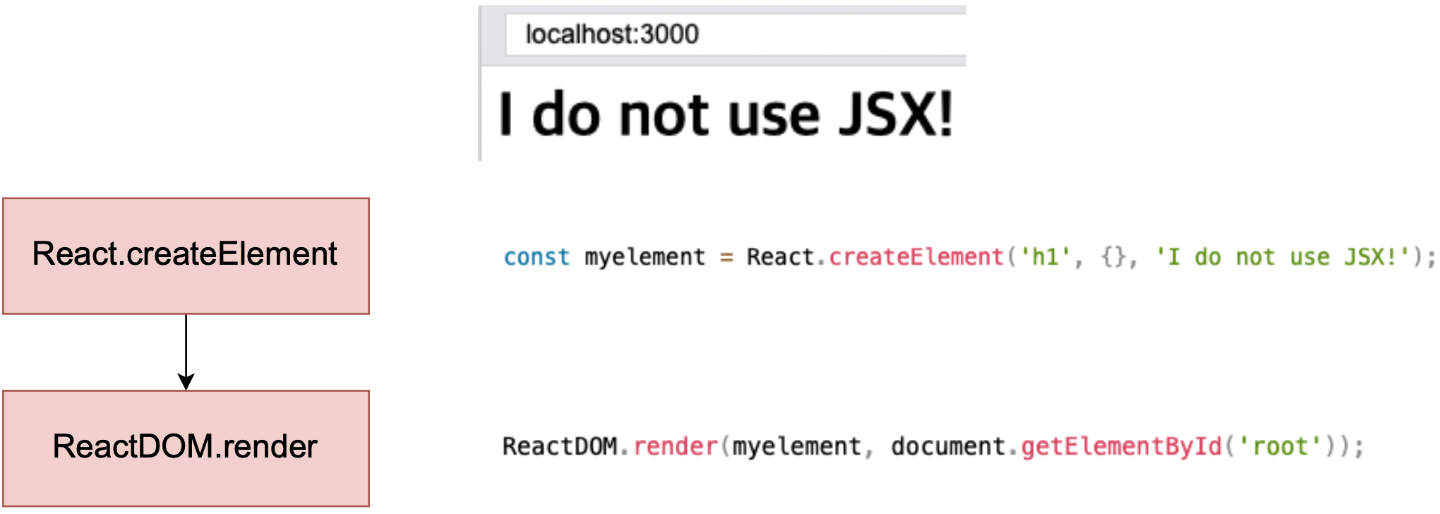 React에서 화면을 그리는 방식은 React.createElement API를 사용해 엘리먼트를 생성한 후, 해당 엘리먼트를 In-Memory에 저장합니다. 그리고 ReactDOM.render 함수를 사용해 실제 웹 브라우저에 그려줍니다.