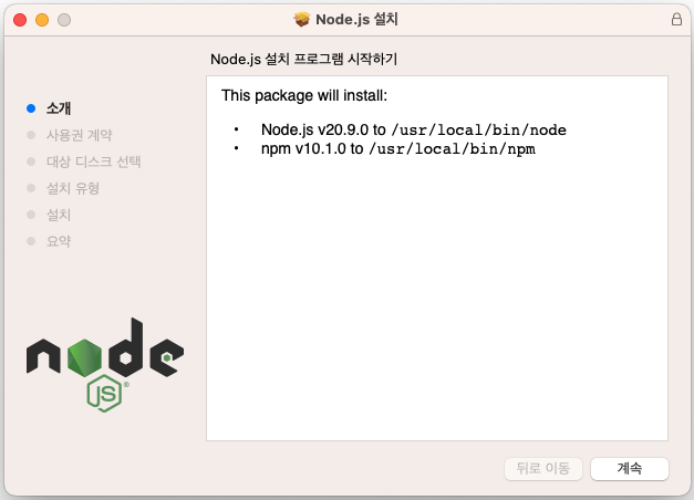 설치 완료 후 터미널에서 node -v 입력하여 정상적으로 설치 되었는지 확인합니다.