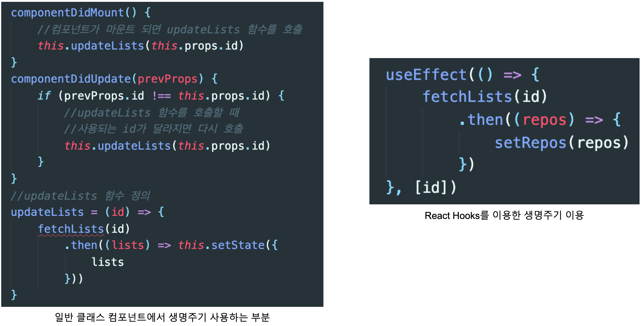 다음은 생명주기를 이용하는 일반 클래스 컴포넌트와 React Hooks의 코드입니다. React Hooks를 이용한 코드가 더 간결한 것을 볼 수 있습니다. React Hooks 에서는 useEffect() 안에서 모든 것을 처리합니다. 다음 코드에서 [id]를 넘겨주면, [id]가 변경될 때마다 fetchLists가 다시 수행됩니다.