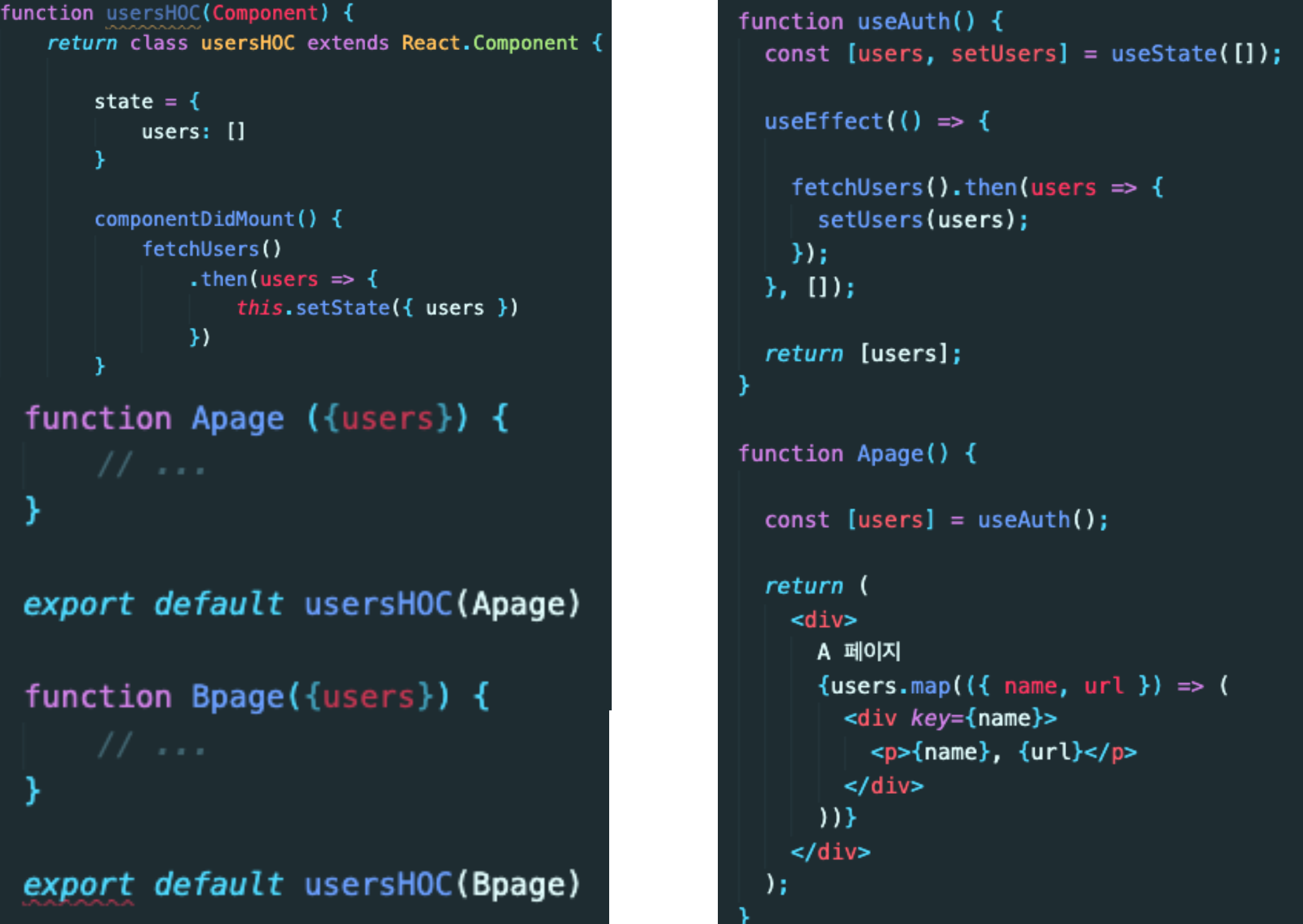다음은 HOC와 Custom React Hooks를 이용한 예제 코드입니다. 왼쪽 코드를 보면 사용자 목록(users)을 가져오는 공통적인 부분을 HOC 컴포넌트에 넣어주고, Apage와 Bpage를 감싸주고 있습니다(Wrapper Component). 오른쪽 코드는 Custom React Hooks를 이용해 useAuth()를 만들고, Apage에서는 useAuth()를 통해 사용자 목록을 가져와 사용하는 것을 볼 수 있습니다.