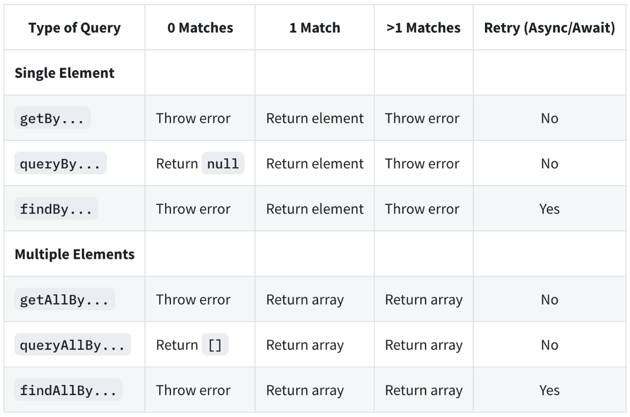 - getBy...: 쿼리에 대해 일치하는 노드를 반환하고, 일치하는 요소가 없거나 둘 이상의 일치가 발견되면 오류를 발생시킵니다(둘 이상의 요소가 예상되는 경우 대신 getAllBy 사용).