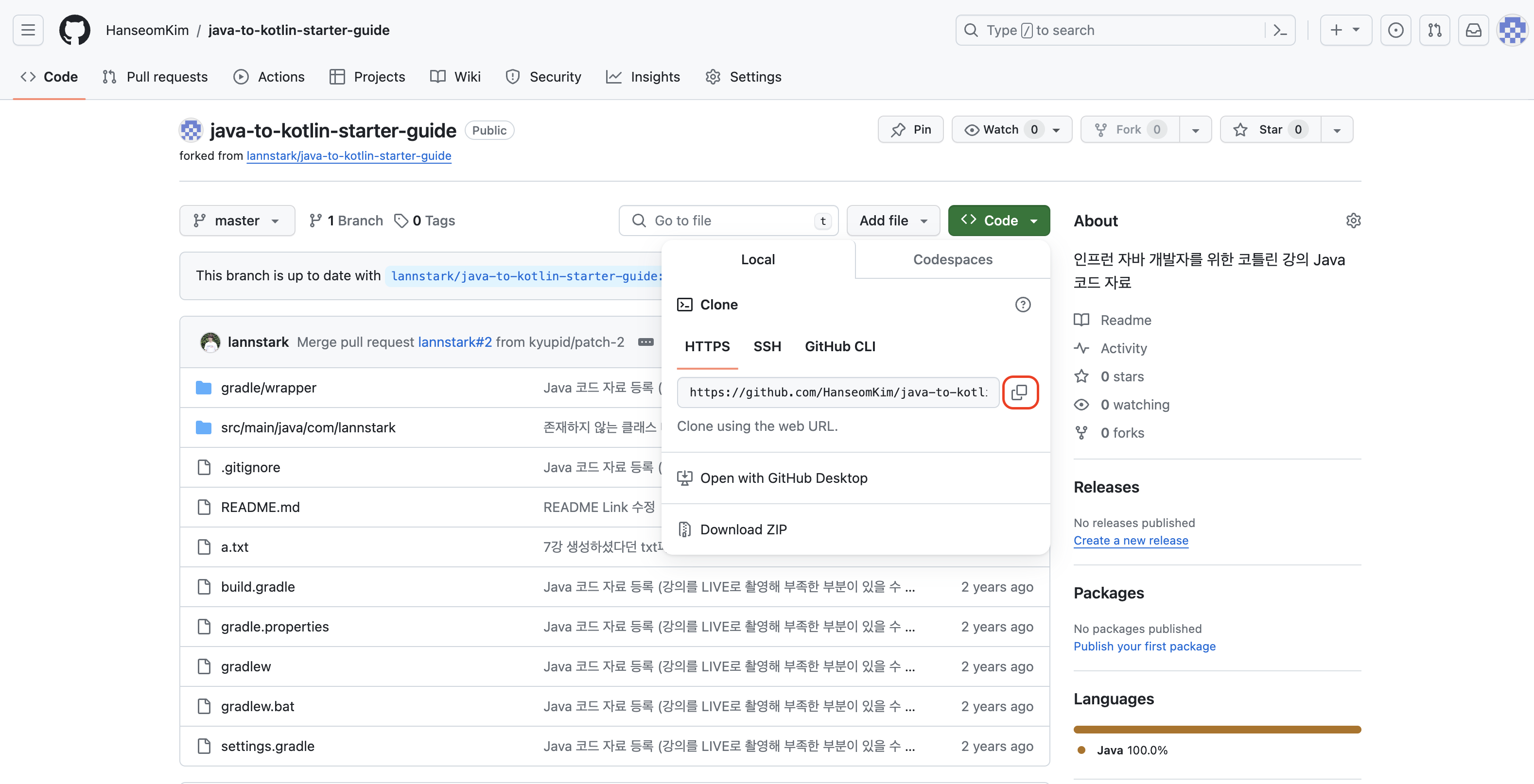 IntelliJ IDEA 기반으로 진행되며, 다음 git repository의 자바 코드를 코틀린 코드로 바꾸며 학습합니다. git clone 또는 zip download 받으시면 됩니다.