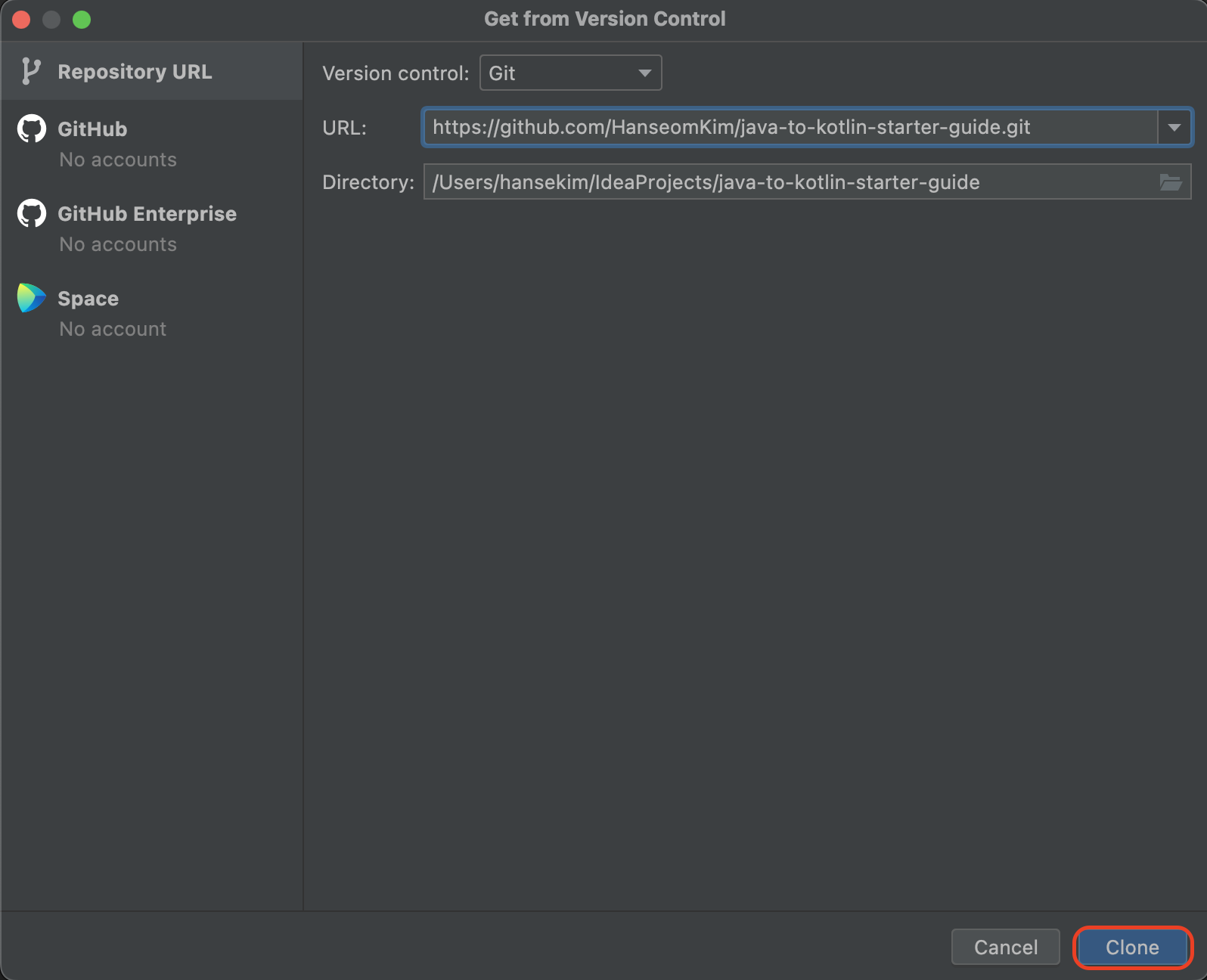 IntelliJ > File > New > Project From Version Control 클릭 후 복사한 URL을 붙여넣고 [Clone] 합니다.