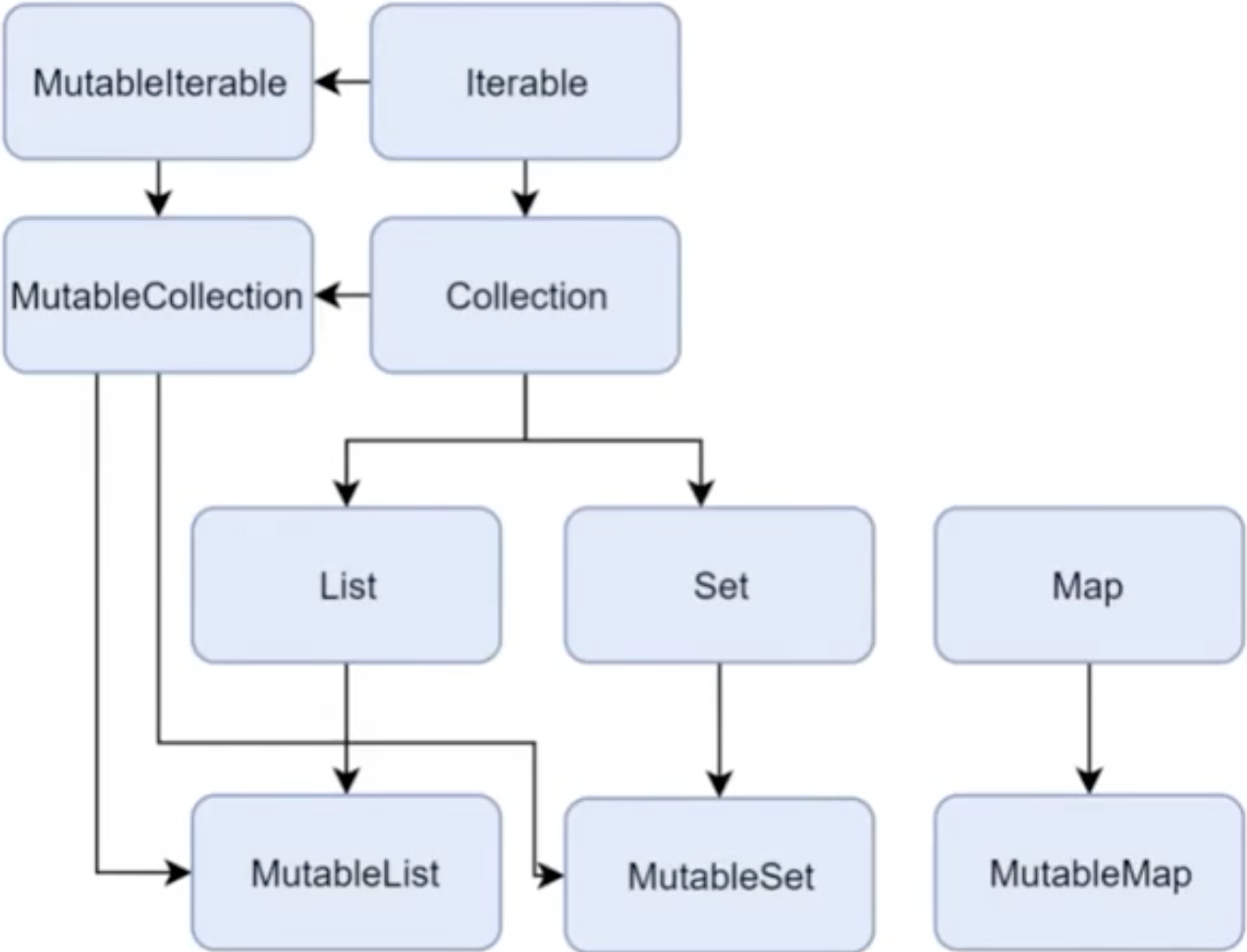 컬렉션을 만들어 줄 때 불변인지, 가변인지를 설정해줘야 합니다. 다음은 Kotlin의 Collection 계층 구조입니다.
