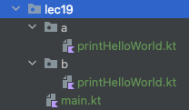 // 함수 typealias FruitFilter = (Fruit) -> Boolean fun filterFruits(fruits: List<Fruit>, filter: FruitFilter) { } // 클래스 data class UltraSuperGuardianTribe( val name: String ) typealias USGTMap = Map<String, UltraSuperGuardianTribe>as import는 어떤 클래스나 함수를 임포트 할 때 이름을 바꾸는 기능입니다. 다음과 같이 서로 다른 패키지에 동일한 함수가 존재할 수 있습니다. main 파일에서 a, b 패키지에 있는 printHelloWorld를 사용하기 위해 as import를 사용합니다.