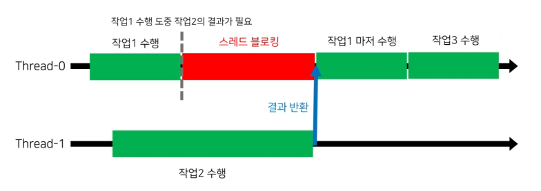 스레드 블로킹이 일어난다. 스레드 블로킹이란 스레드가 사용될 수 없는 상태에 있는 것을 뜻합니다.