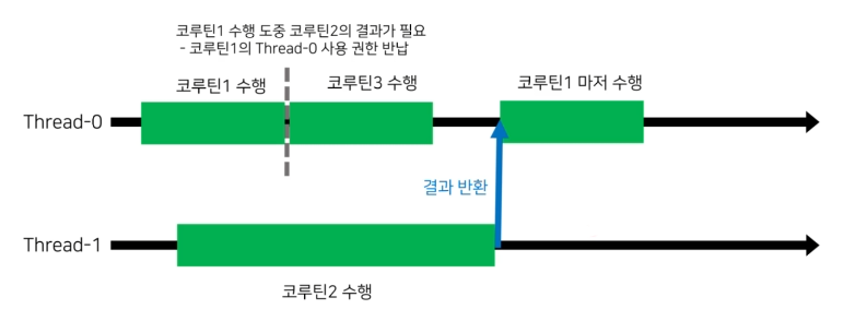 - 코루틴은 스레드의 사용 권한을 양보할 수 있습니다.