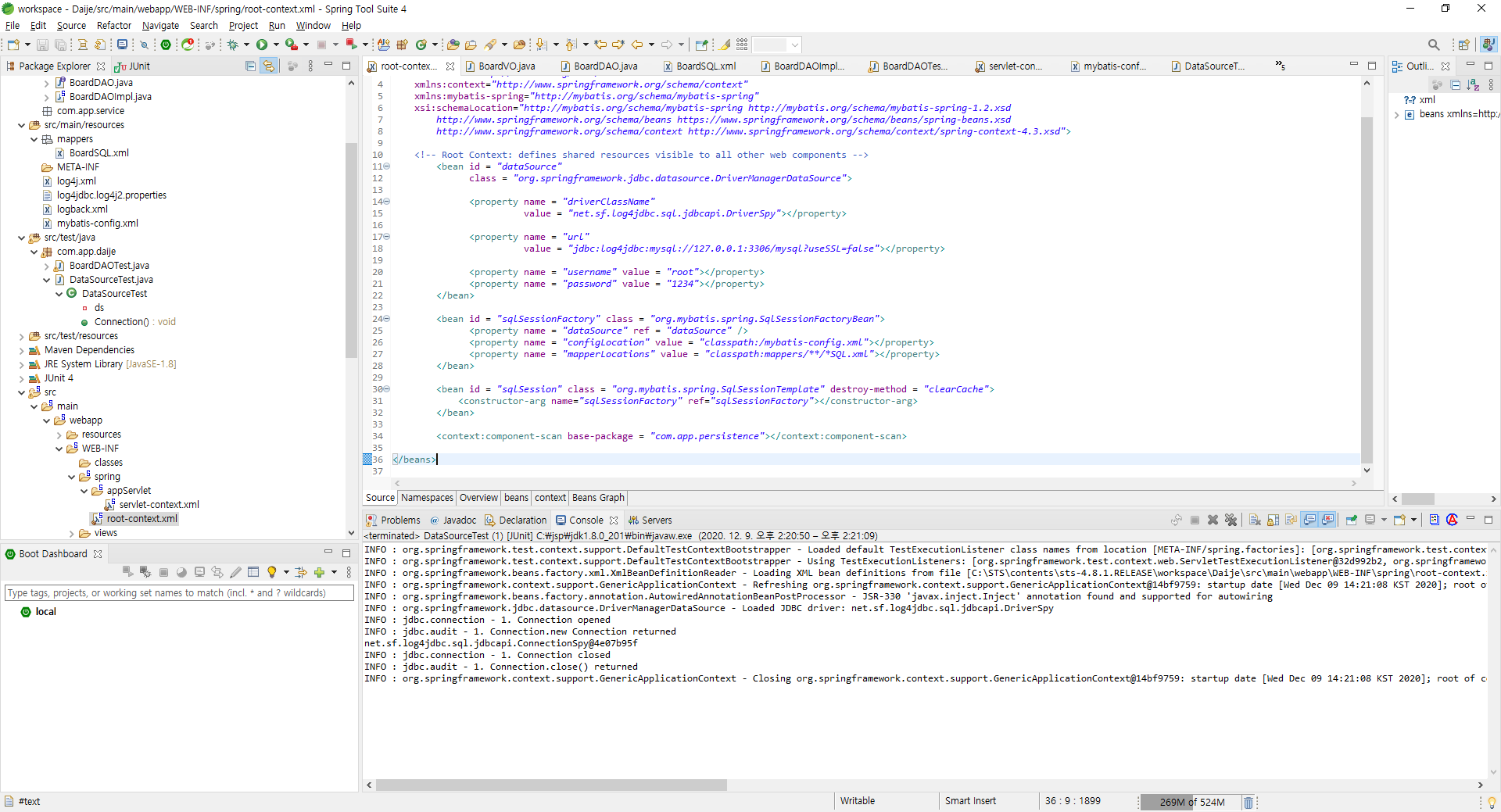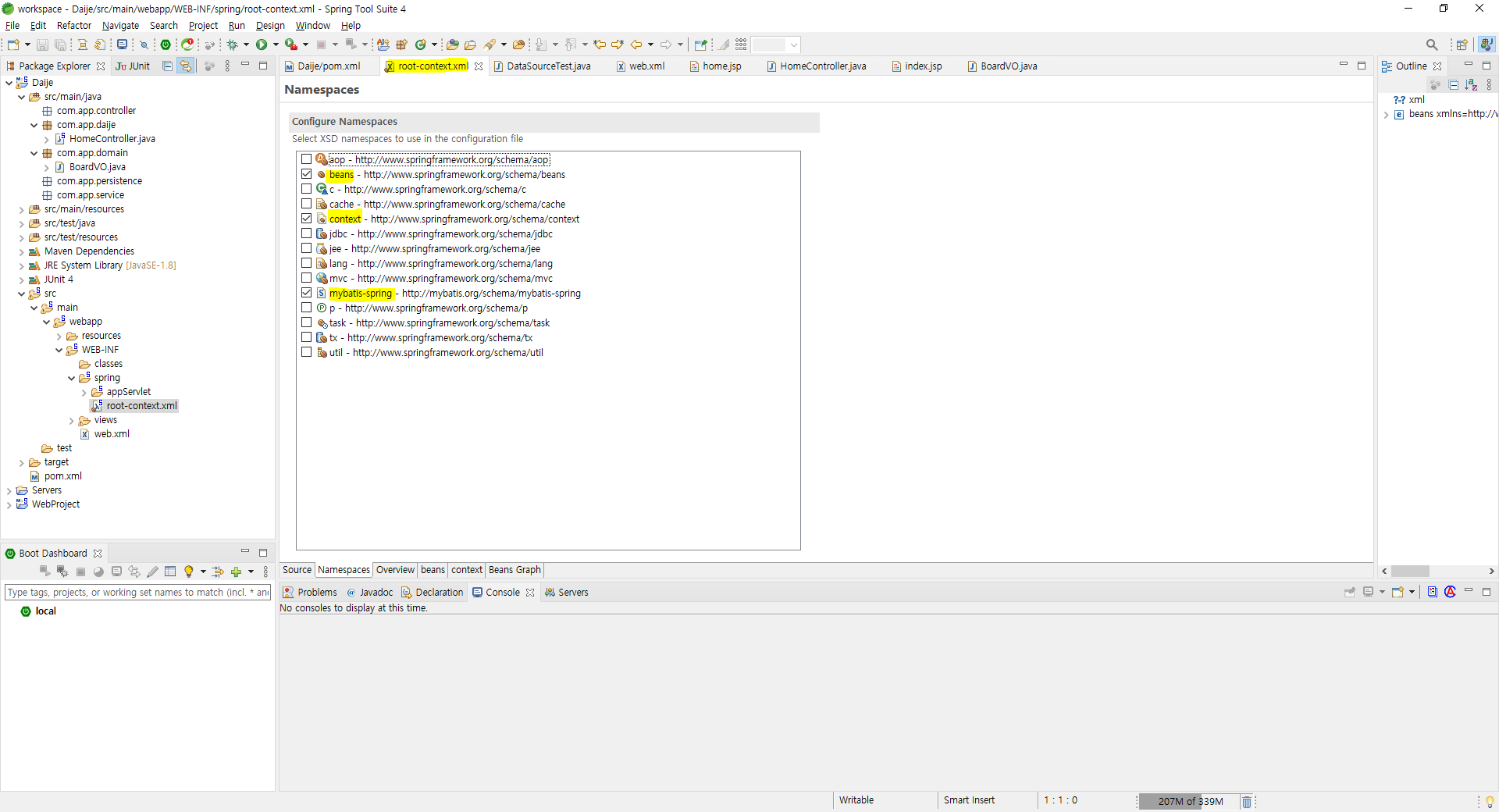 > root-context.xml 파일 선택 > [NameSpaces] 탭 선택 > beans, context, mybatis-spring 체크 > 저장