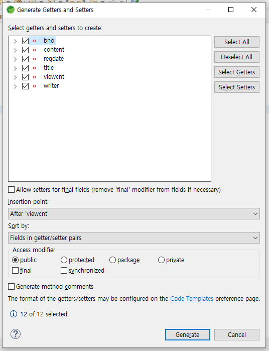 Note) getter/setter 생성 방법 - 변수 설정 후 마우스 우클릭 > Source > Generate Getters and Setters