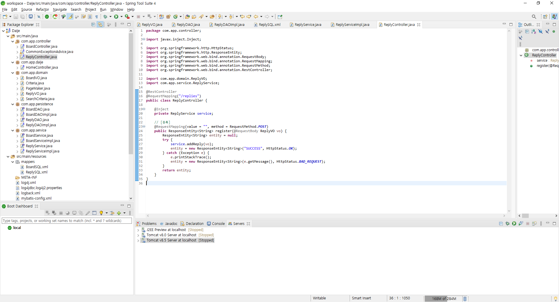 06. 삭제 Controller (REST 방식) (0) 2021.01.11 05. 수정 Controller (REST 방식) (0) 2021.01.11 04. 목록 Controller (REST 방식) (0) 2020.12.30 02. TABLE 생성, Domain ~ Service (0) 2020.12.29 01. REST와 Ajax (0) 2020.12.22