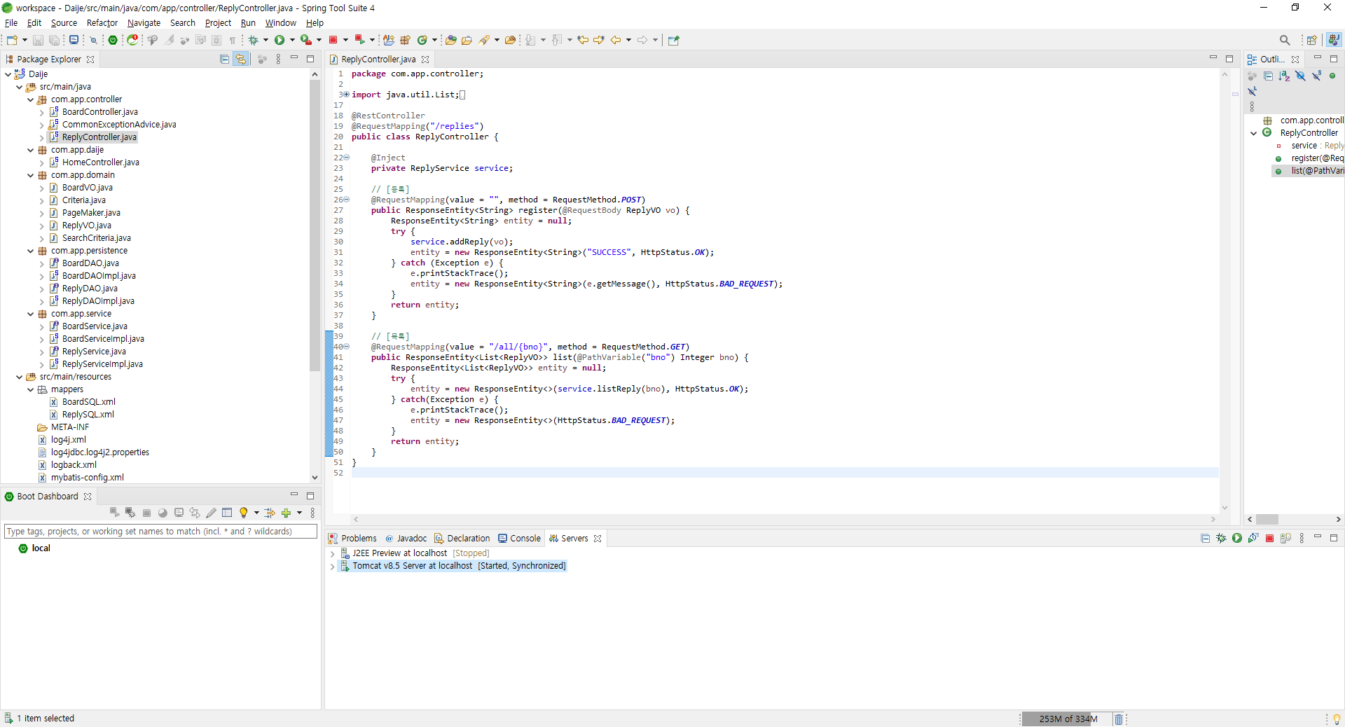06. 삭제 Controller (REST 방식) (0) 2021.01.11 05. 수정 Controller (REST 방식) (0) 2021.01.11 03. 등록 Controller (REST 방식) (0) 2020.12.29 02. TABLE 생성, Domain ~ Service (0) 2020.12.29 01. REST와 Ajax (0) 2020.12.22