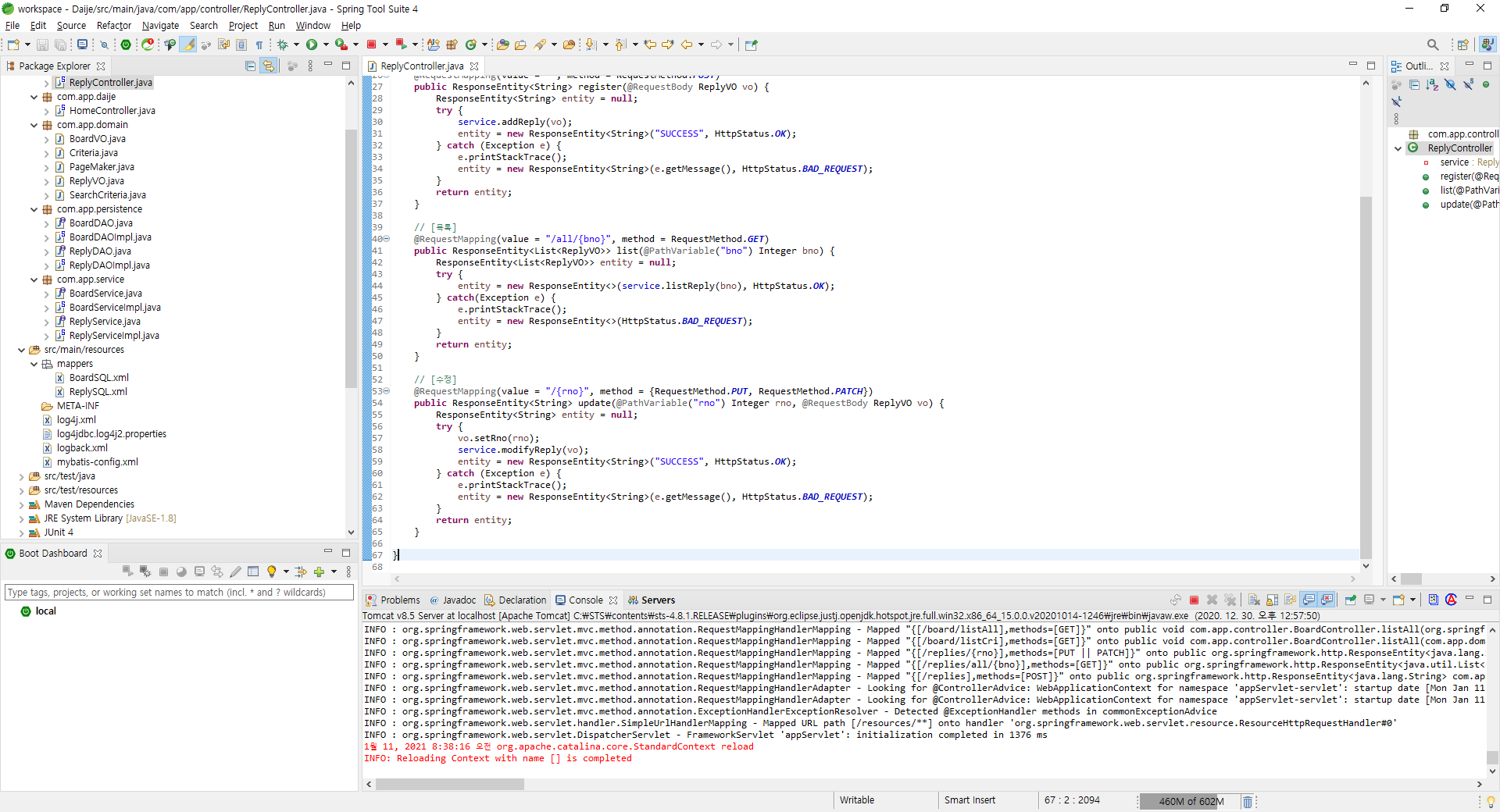 07. 댓글 - 페이징 (0) 2021.01.12 06. 삭제 Controller (REST 방식) (0) 2021.01.11 04. 목록 Controller (REST 방식) (0) 2020.12.30 03. 등록 Controller (REST 방식) (0) 2020.12.29 02. TABLE 생성, Domain ~ Service (0) 2020.12.29