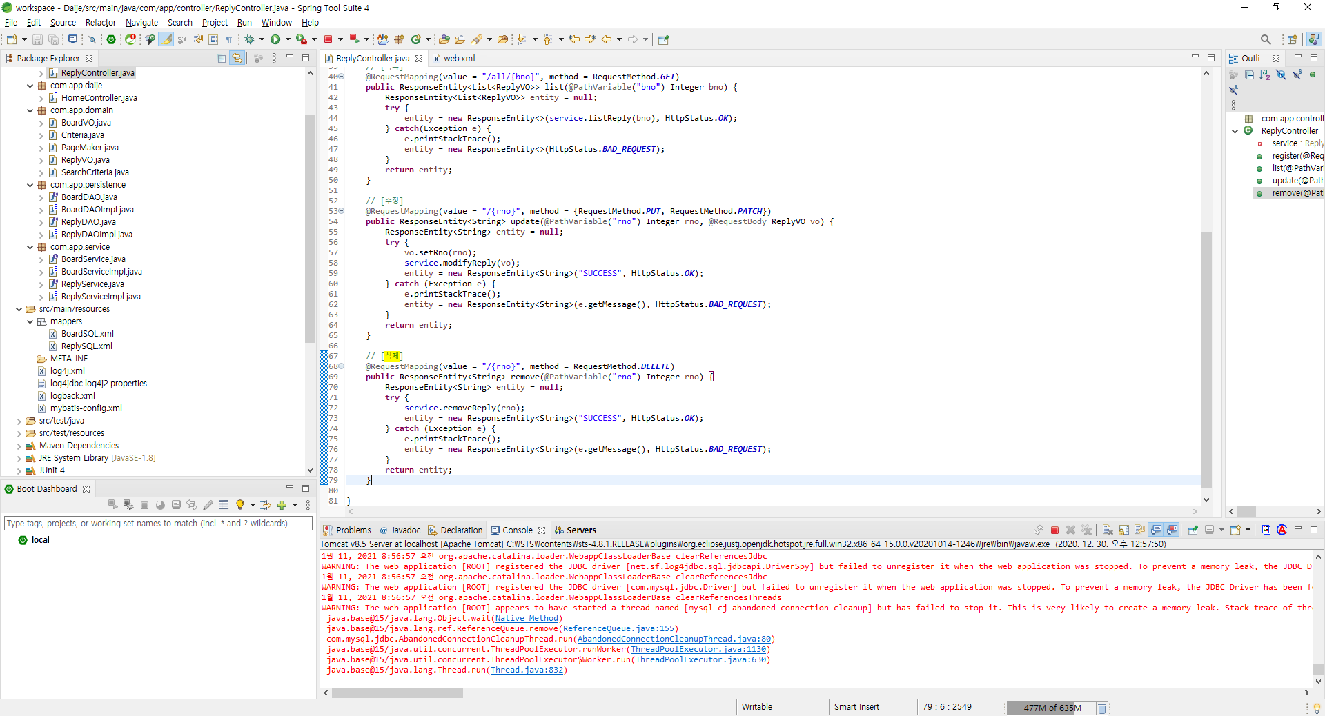 08. 댓글 - View (0) 2021.01.16 07. 댓글 - 페이징 (0) 2021.01.12 05. 수정 Controller (REST 방식) (0) 2021.01.11 04. 목록 Controller (REST 방식) (0) 2020.12.30 03. 등록 Controller (REST 방식) (0) 2020.12.29