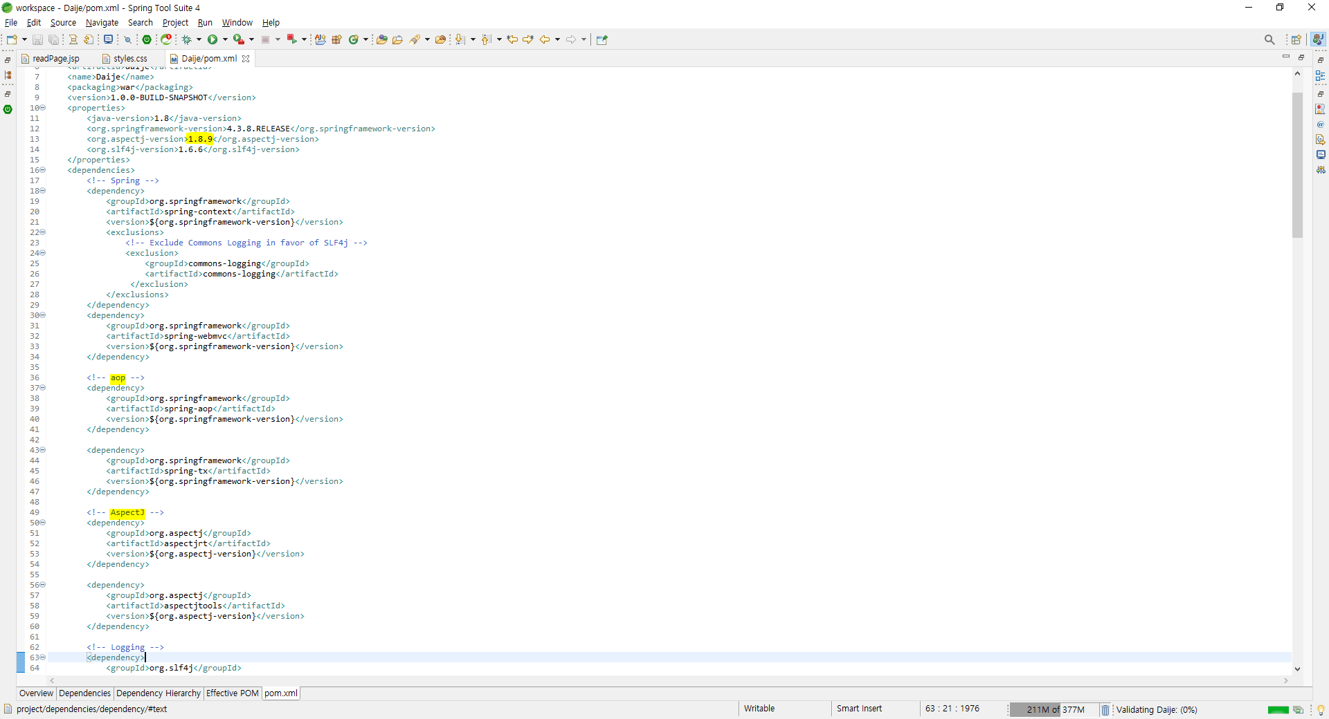 타입 기능 Before Advice target의 메소드 호출 전 적용 After returning target의 메소드 호출 이후 적용 After throwing target의 예외 발생 후 적용 After target의 메소드 호출 후 예외의 발생에 관계없이 적용 Around target의 메소드 호출 이전과 이후 모두 적용 4. 라이브러리 추가