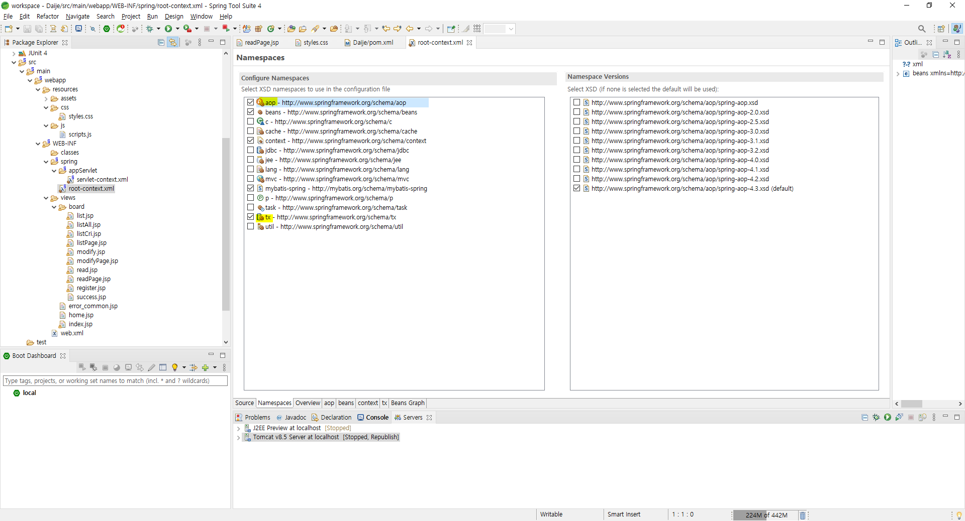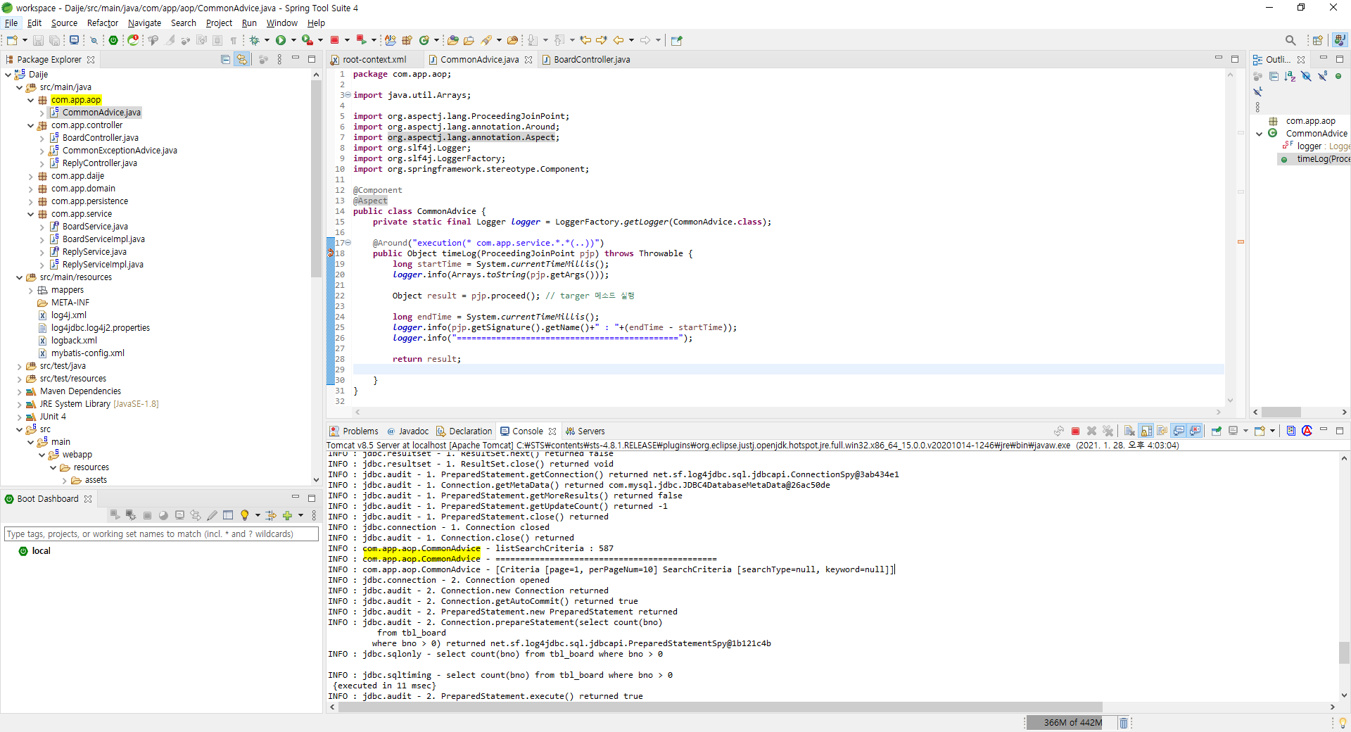 root-context.xml > 1) com.app.aop package 인식하도록 설정, 2) <aop:config> 추가 (향후 XML방식으로 AOP 기능 설정 시 사용, 3) <aop:aspectj-autoproxy>는 자동으로 AspectJ 라이브러리를 이용해서 Proxy 객체를 생성해 내는 용도로 사용 6. CommonAdvice