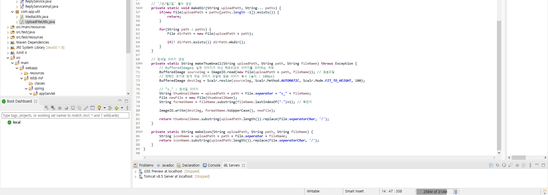 > uploadFile : 파일 업로드 (이미지 파일의 경우 makeThumbnail 호출, 이미지 파일이 아닌 경우 makeIcon 호출)